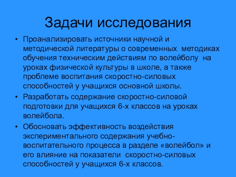 Обосновать эффективность воздействия экспериментального содержания учебно-воспитательного процесса в разделе «волейбол» и его влияние на показатели скоростно-силовых способностей у учащихся 6-х классов.