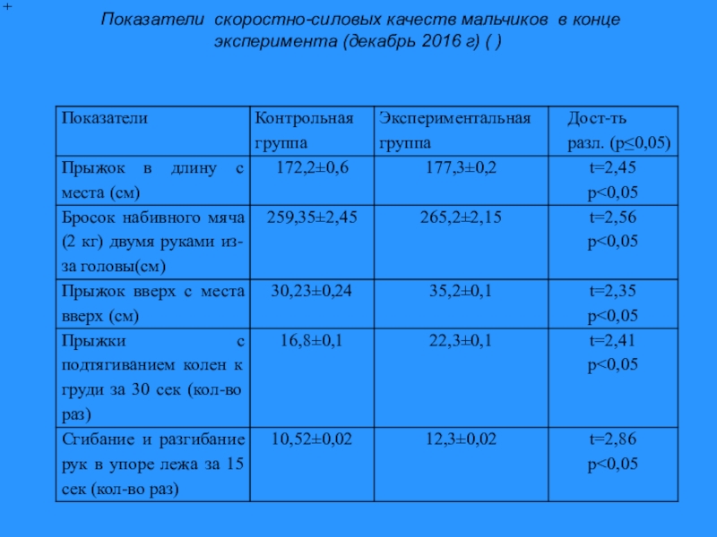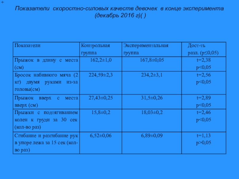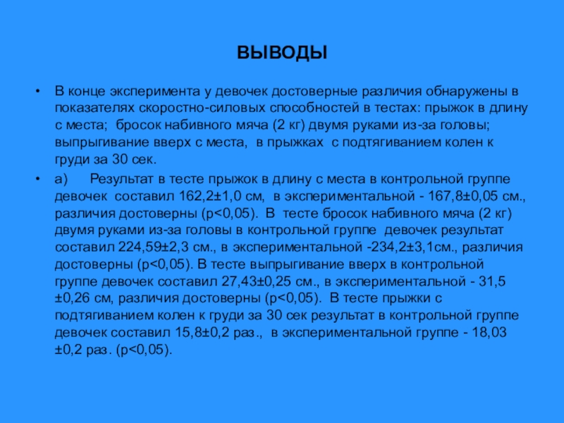 В конце эксперимента у девочек достоверные различия обнаружены в показателях скоростно-силовых
