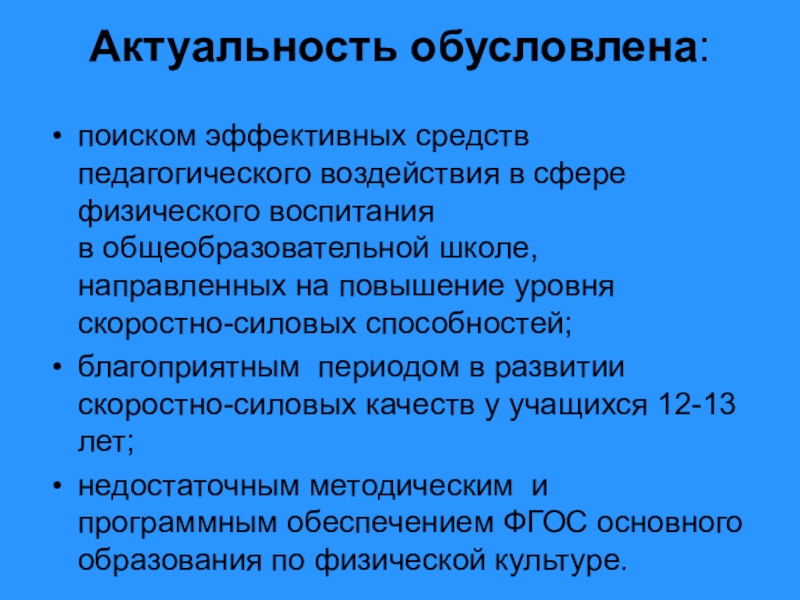 настоящее время актуальным является поиск эффективных средств педагогического воздействия в сфере физического воспитания в общеобразовательной школе, направленных на повышение уровня скоростно-силовых способностей.