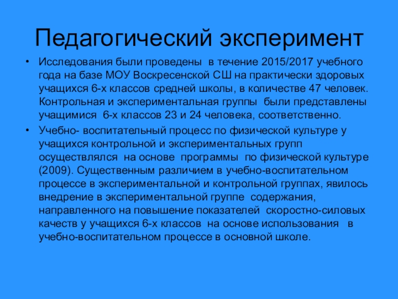 МОУ Воскресенской СШ на практически здоровых учащихся 6-х классов средней школы, в количестве 47 человек. Контрольная и экспериментальная группы были представлены учащимися 6-х классов 23 и 24 человека, соответственно.