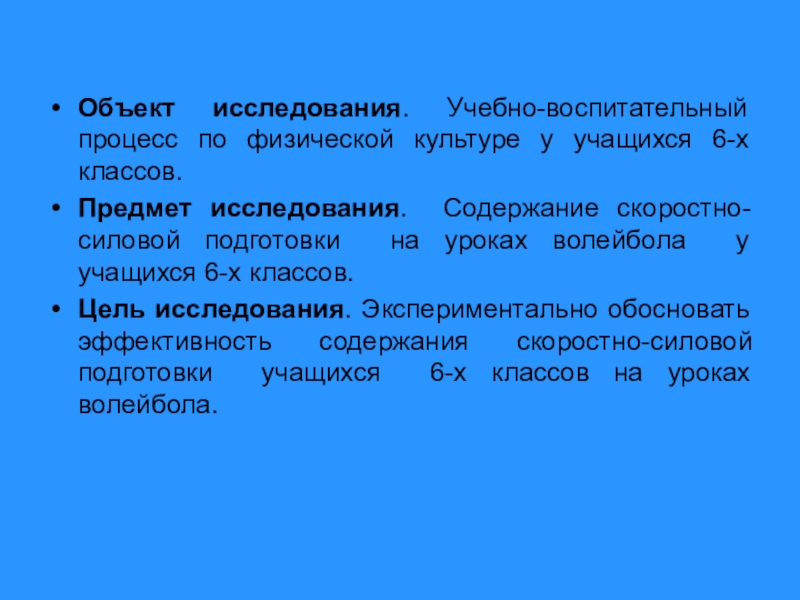 Слайд 4Объект исследования. Учебно-воспитательный процесс по физической культуре у учащихся 6-х классов.