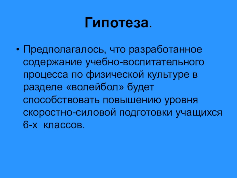 Цель исследования. Экспериментально обосновать эффективность содержания скоростно-силовой подготовки учащихся 6-х классов на уроках волейбола.