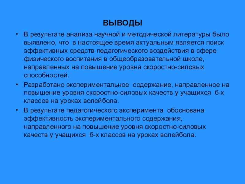 Разработано экспериментальное содержание, направленное на повышение уровня скоростно-силовых качеств у учащихся 6-х классов на уроках волейбола.