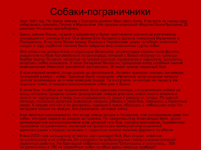 уже нет в живых, тем более нет в живых и собак — участников Великой Отечественной войны. Но память о бессмертном подвиге хвостатых воинов жива.