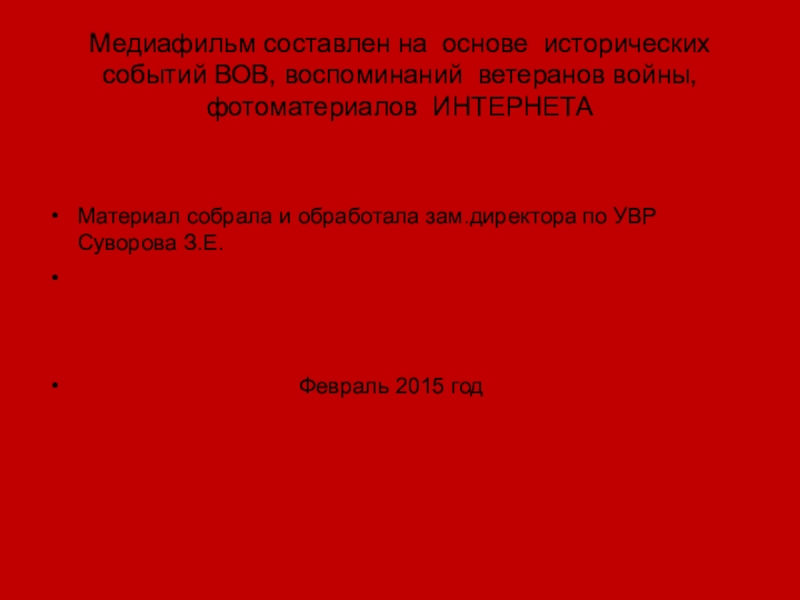Слайд 41Медиафильм составлен на основе исторических событий ВОВ, воспоминаний ветеранов войны, фотоматериалов