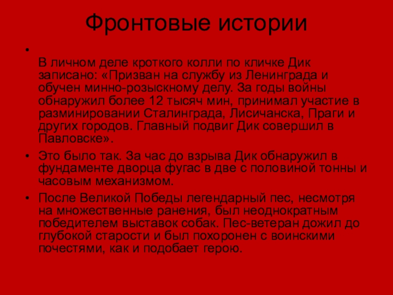 на службу из Ленинграда и обучен минно-розыскному делу. За годы войны обнаружил более 12 тысяч мин, принимал участие в разминировании Сталинграда, Лисичанска, Праги и других городов. Главный подвиг Дик совершил в Павловске».