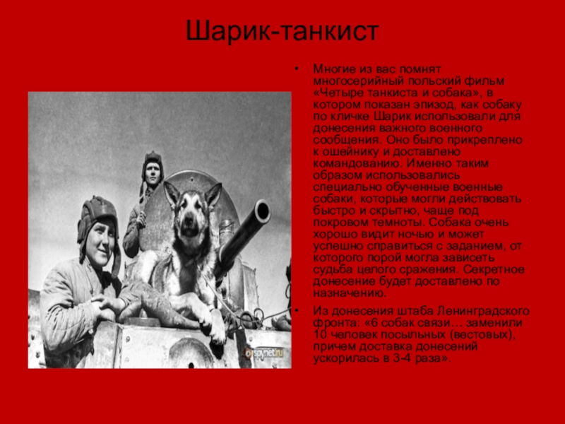 Из донесения штаба Ленинградского фронта: «6 собак связи… заменили 10 человек посыльных (вестовых), причем доставка донесений ускорилась в 3-4 раза».