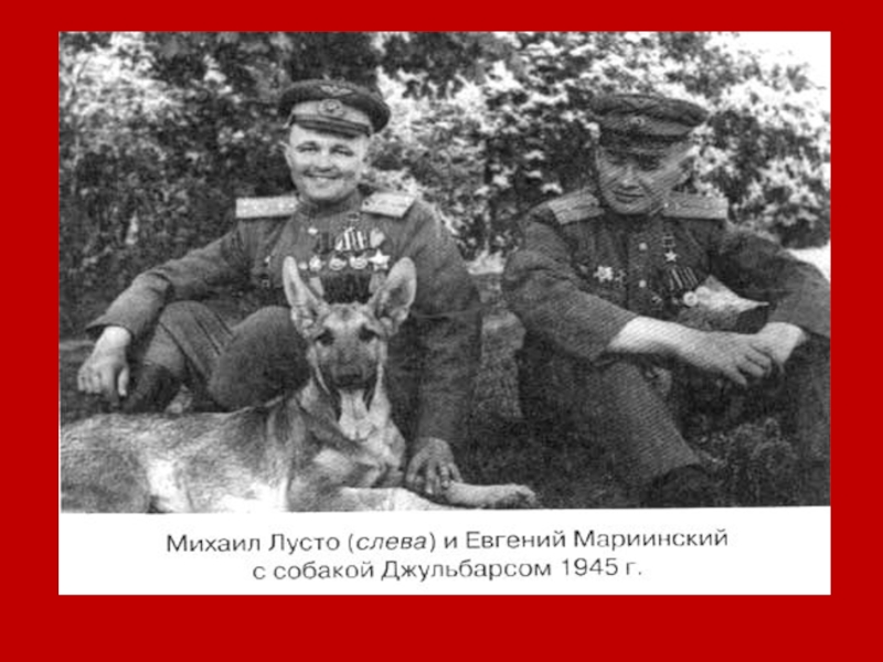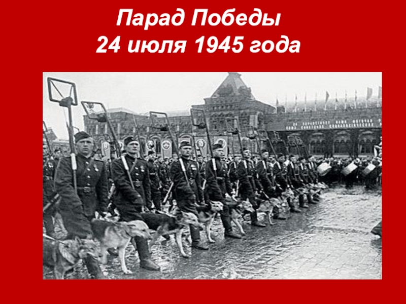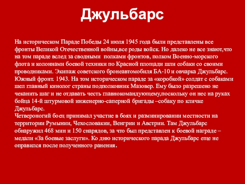 фронты Великой Отечественной войны,все роды войск. Но далеко не все знают,что на том параде вслед за сводными полками фронтов, полком Военно-морского флота и колоннами боевой техники по Красной площади шли собаки со своими проводниками. Экипаж советского бронеавтомобиля БА-10 и овчарка Джульбарс. Южный фронт. 1943. На том историческом параде за «коробкой» солдат с собаками шел главный кинолог страны подполковник Мазовер. Ему было разрешено не чеканить шаг и не отдавать честь главнокомандующему,поскольку он нес на руках бойца 14-й штурмовой инженерно-саперной бригады –собаку по кличке Джульбарс.