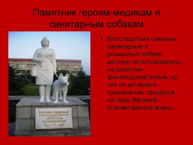 Слайд 33Памятник героям-медикам и санитарным собакам