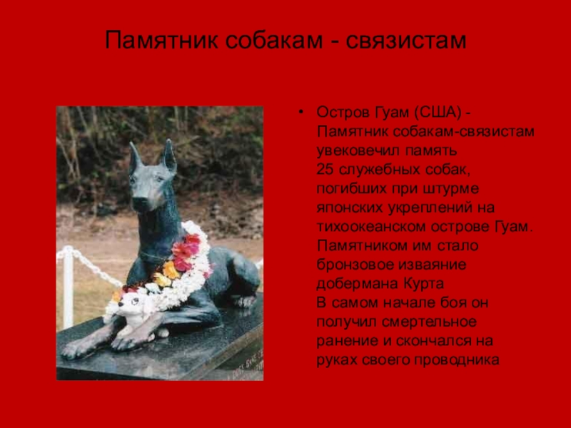 25 служебных собак, погибших при штурме японских укреплений на тихоокеанском острове Гуам. Памятником им стало бронзовое изваяние добермана Курта