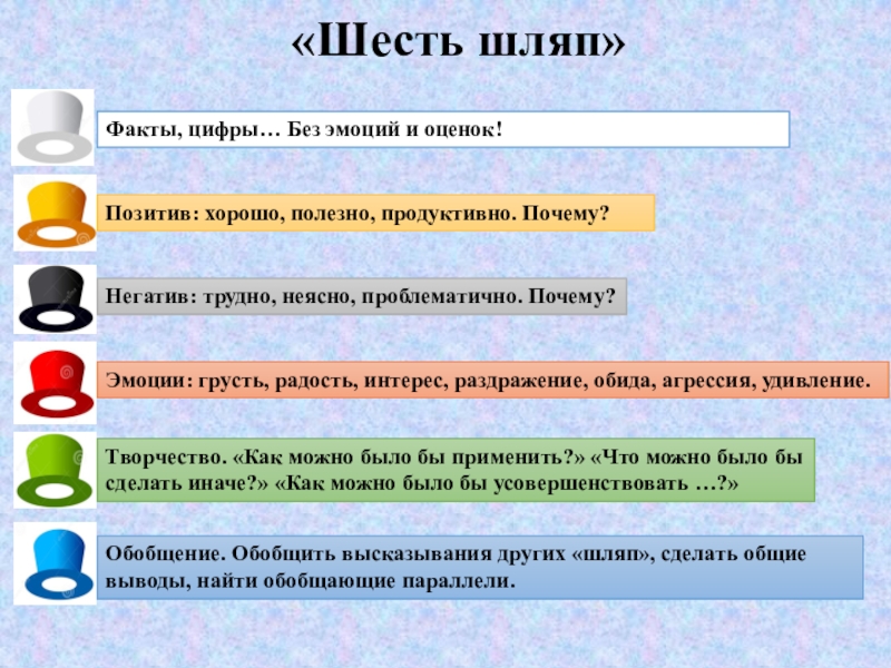 Обобщение. Обобщить высказывания других «шляп», сделать общие выводы, найти обобщающие параллели.