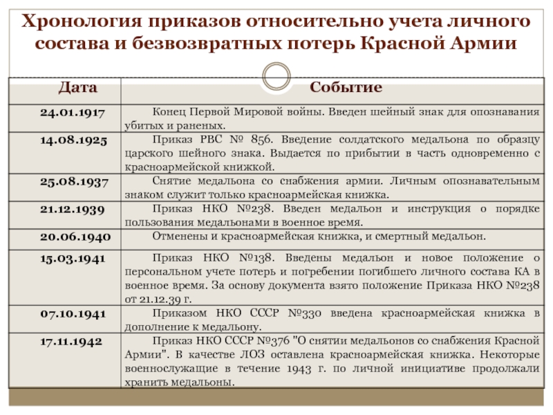 Хронология приказов относительно учета личного состава и безвозвратных потерь Красной Армии