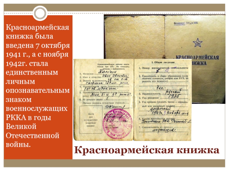 Красноармейская книжка Красноармейская книжка была введена 7 октября 1941 г., а с ноября 1942г. стала единственным личным