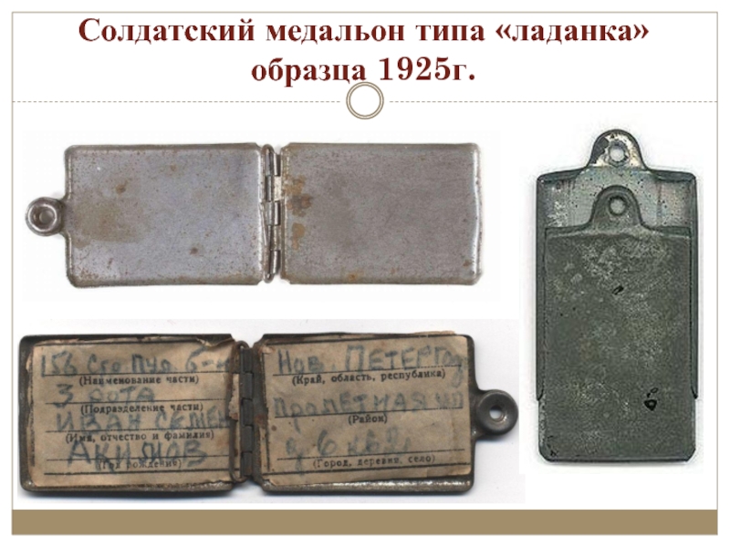Слайд 7Солдатский медальон типа «ладанка» образца 1925г.