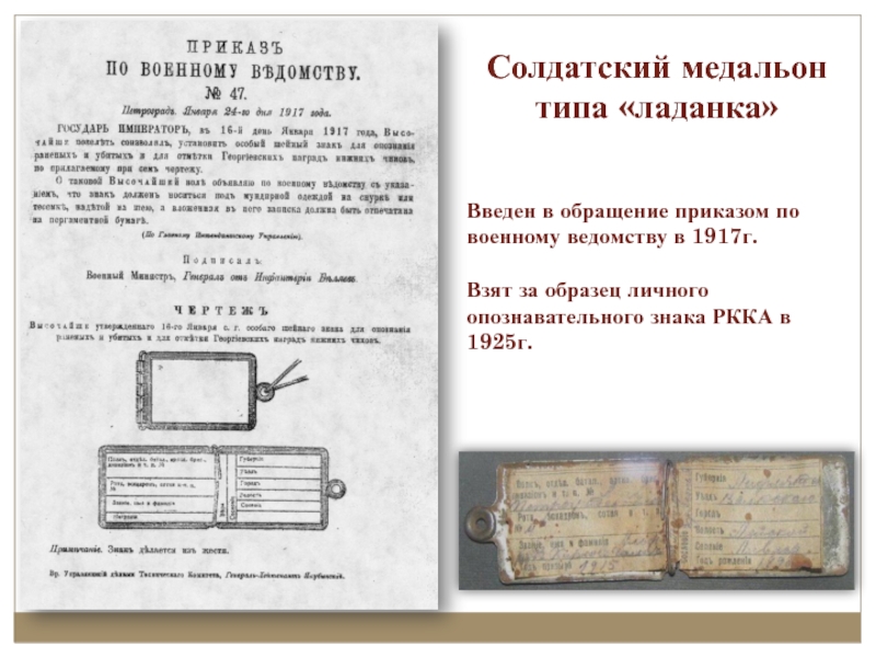 Солдатский медальон типа «ладанка»Введен в обращение приказом по военному ведомству в 1917г.Взят за образец личного опознавательного знака