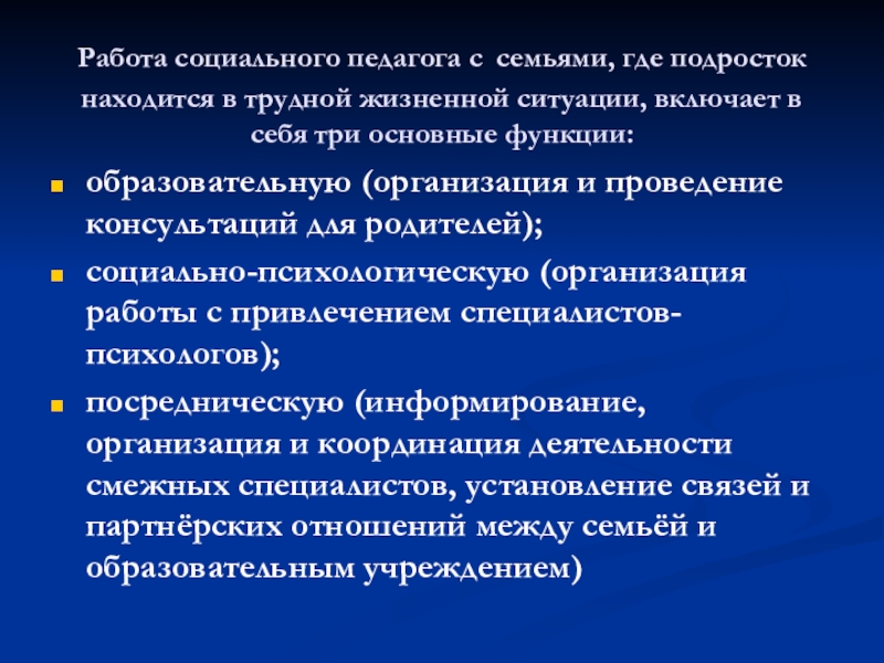 посредническую (информирование, организация и координация деятельности смежных специалистов, установление связей и партнёрских отношений между семьёй и образовательным учреждением)