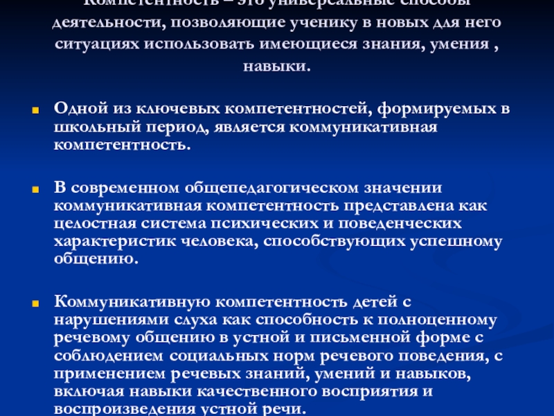 Коммуникативную компетентность детей с нарушениями слуха как способность к полноценному речевому общению в устной и письменной форме с соблюдением социальных норм речевого поведения, с применением речевых знаний, умений и навыков, включая навыки качественного восприятия и воспроизведения устной речи.