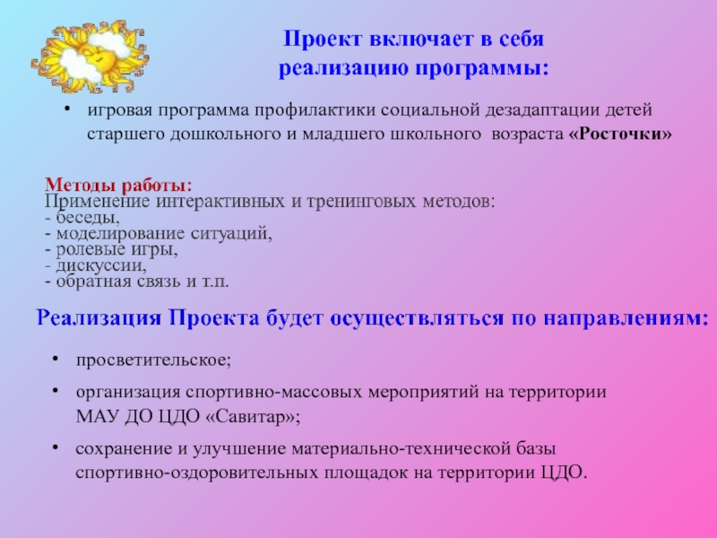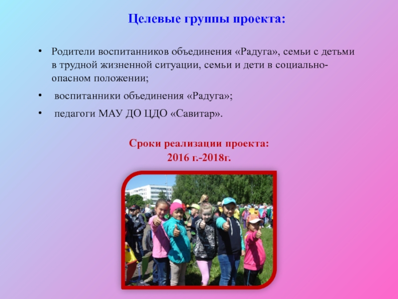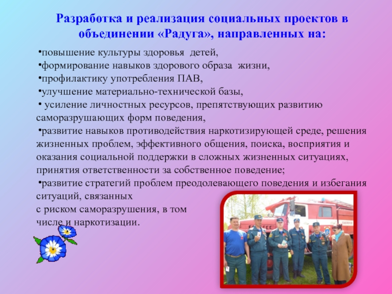 Слайд 13Разработка и реализация социальных проектов в объединении «Радуга», направленных на: