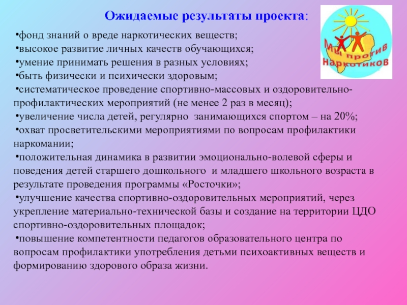 - Способствовать созданию в среде внеурочной деятельности обучающихся условий, препятствующих распространению наркотиков, формировать устойчивый психологический иммунитет к наркотикам.
