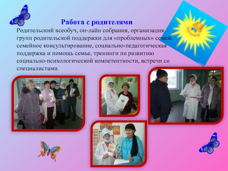 «проблемных» семей, семейное консультирование, социально-педагогическая поддержка и помощь семье, тренинги по развитию социально-психологической компетентности, встречи со специалистами.