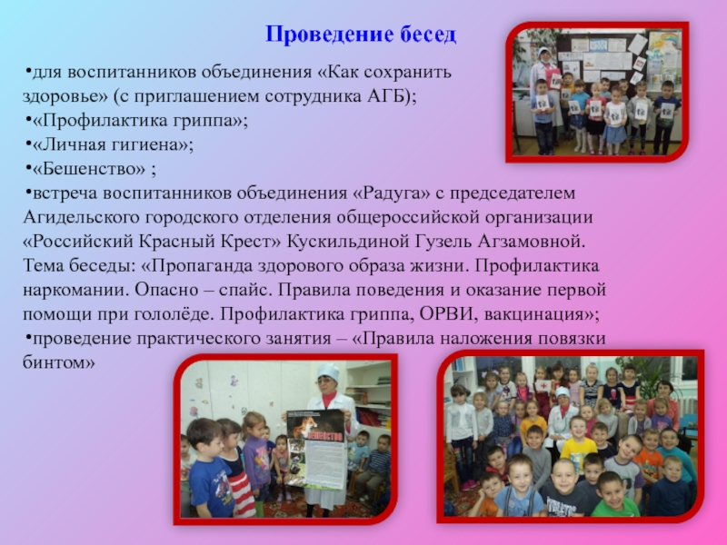 встреча воспитанников объединения «Радуга» с председателем Агидельского городского отделения общероссийской организации «Российский Красный Крест» Кускильдиной Гузель Агзамовной. Тема беседы: «Пропаганда здорового образа жизни. Профилактика наркомании. Опасно – спайс. Правила поведения и оказание первой помощи при гололёде. Профилактика гриппа, ОРВИ, вакцинация»;