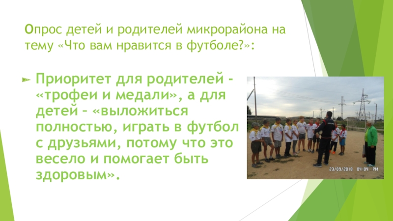 Приоритет для родителей - «трофеи и медали», а для детей – «выложиться полностью, играть в футбол с друзьями, потому что это весело и помогает быть здоровым».