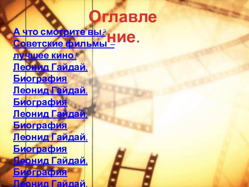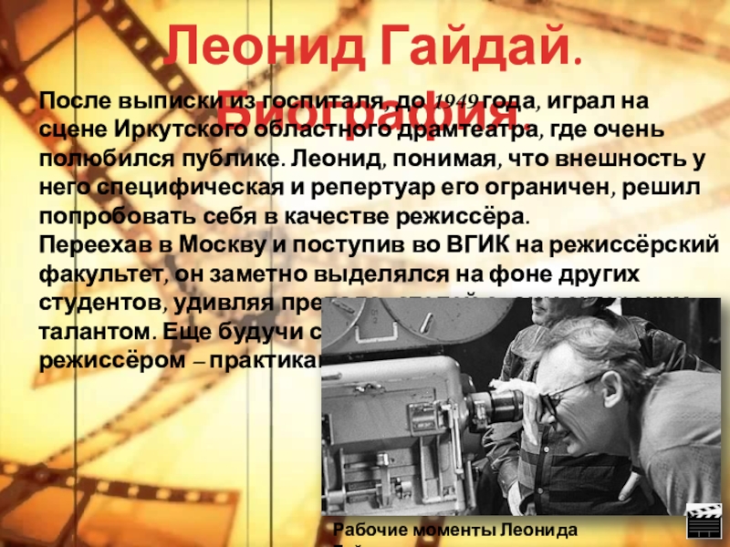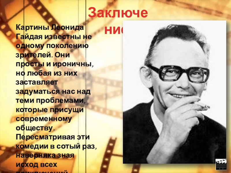 быть точнее - комедии! Во многих семьях даже существует традиция пересматривать эти фильмы, особенно в новогодние праздники. И каждый раз эти фильмы оставляют неизгладимое впечатление, а с их сюжеты актуальны по сей день! Какой человек не знает Шурика из «Кавказской пленницы» или Ивана IV из «Иван Васильевич меняет профессию»? А ведь все эти фильмы, заставляющие нас смеяться вновь даже после многократного просмотра, - творение одного мастера, советского кинорежиссера Леонида Иовича Гайдая.