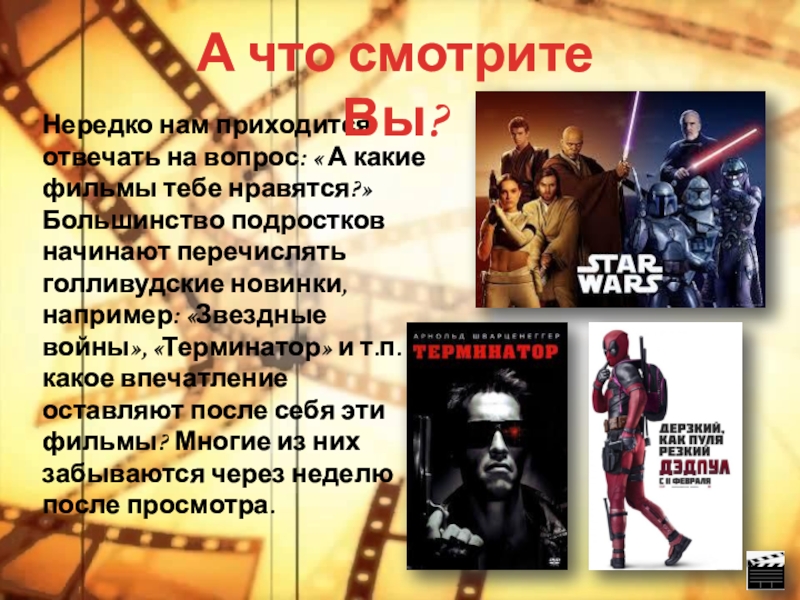 нравятся?» Большинство подростков начинают перечислять голливудские новинки, например: «Звездные войны», «Терминатор» и т.п. А какое впечатление оставляют после себя эти фильмы? Многие из них забываются через неделю после просмотра.
