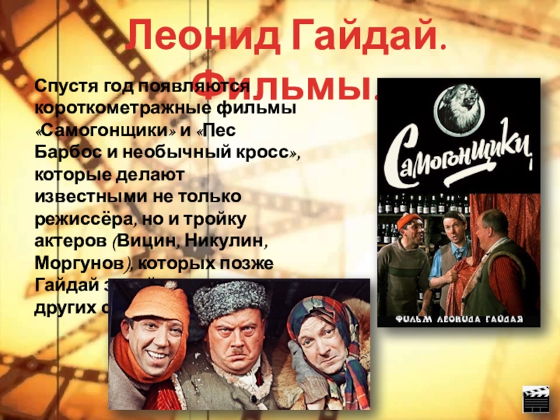 и необычный кросс», которые делают известными не только режиссёра, но и тройку актеров (Вицин, Никулин, Моргунов), которых позже Гайдай задействует и в других своих картинах.