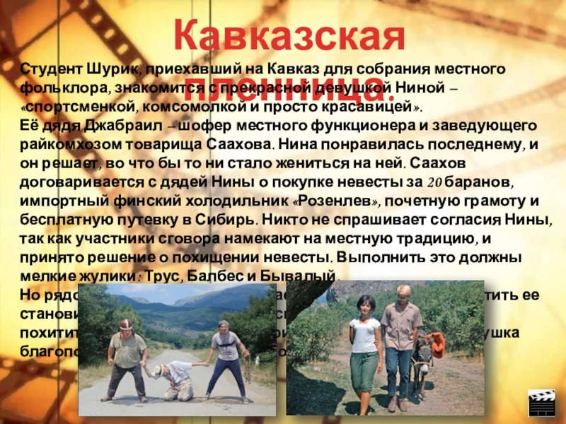 Её дядя Джабраил – шофер местного функционера и заведующего райкомхозом товарища Саахова. Нина понравилась последнему, и он решает, во что бы то ни стало жениться на ней. Саахов договаривается с дядей Нины о покупке невесты за 20 баранов, импортный финский холодильник «Розенлев», почетную грамоту и бесплатную путевку в Сибирь. Никто не спрашивает согласия Нины, так как участники сговора намекают на местную традицию, и принято решение о похищении невесты. Выполнить это должны мелкие жулики: Трус, Балбес и Бывалый.