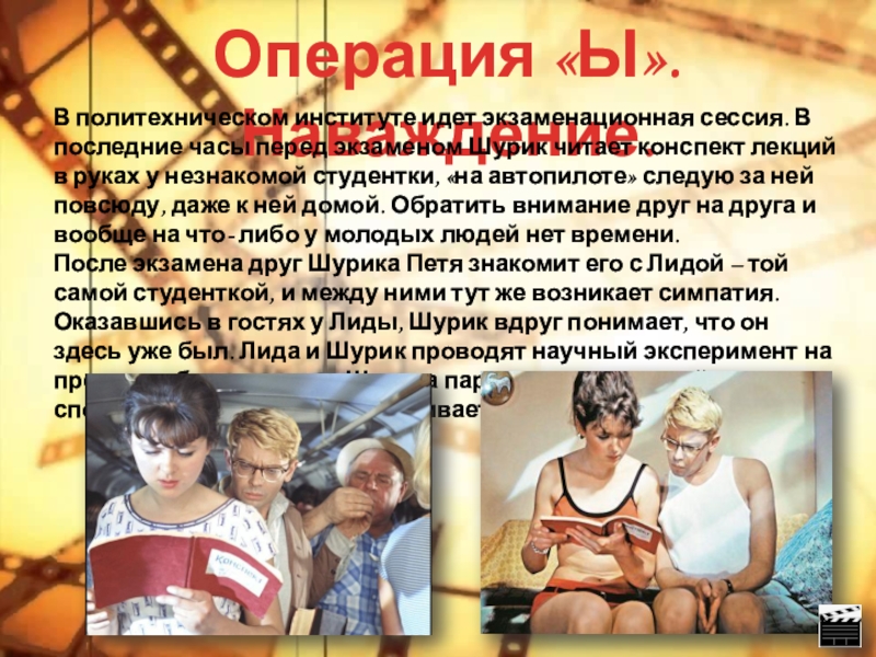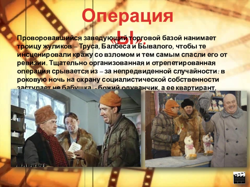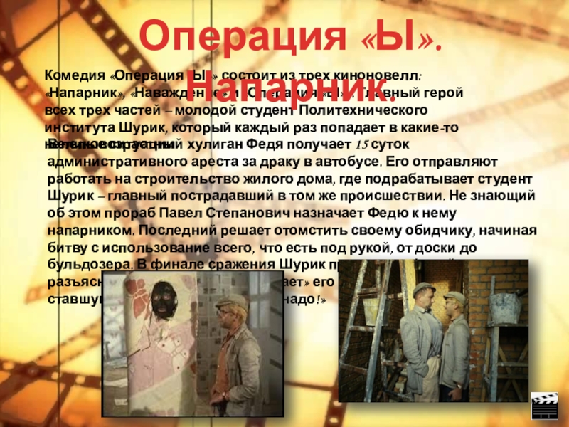 Слайд 15Комедия «Операция «Ы»» состоит из трех киноновелл: «Напарник», «Наваждение» и «Операция