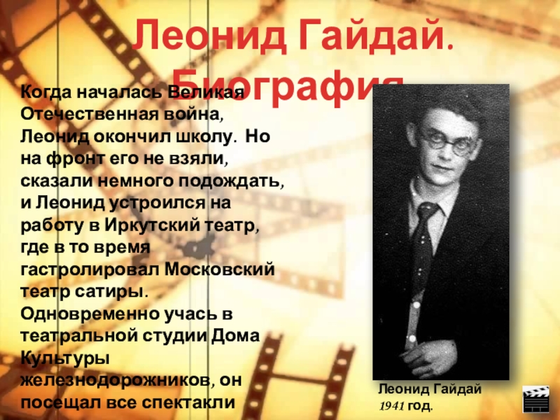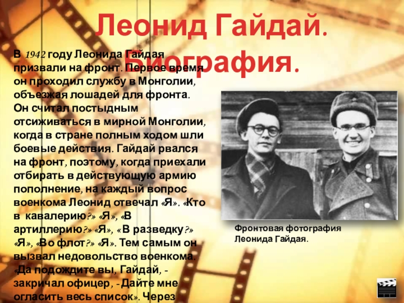 В 1942 году Леонида Гайдая призвали на фронт. Первое