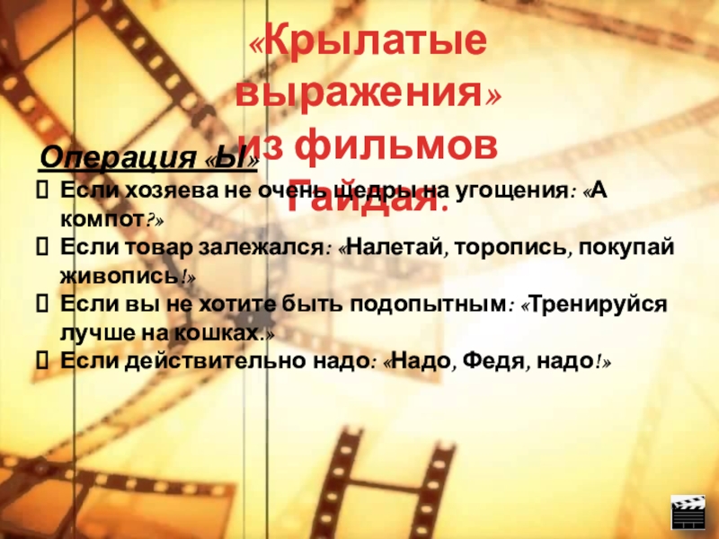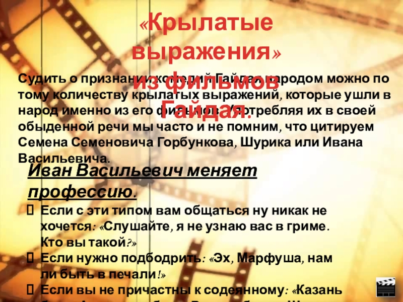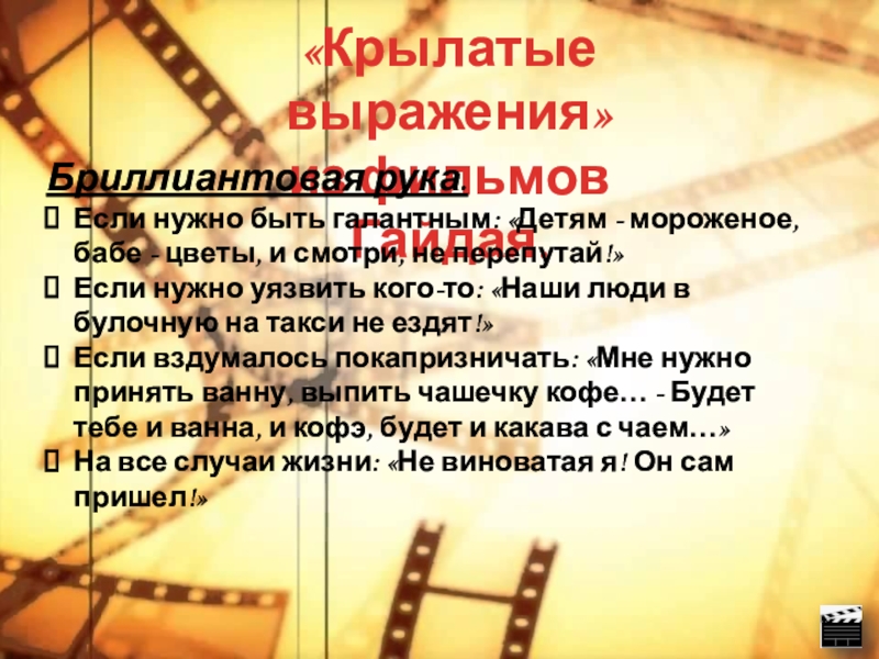 Слайд 22Судить о признании комедий Гайдая народом можно по тому количеству крылатых