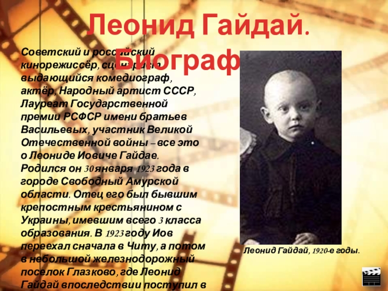Лауреат Государственной премии РСФСР имени братьев Васильевых, участник Великой Отечественной войны – все это о Леониде Иовиче Гайдае. Родился он 30 января 1923 года в городе Свободный Амурской области. Отец его был бывшим крепостным крестьянином с Украины, имевшим всего 3 класса образования. В 1923 году Иов переехал сначала в Читу, а потом в небольшой железнодорожный поселок Глазково, где Леонид Гайдай впоследствии поступил в железнодорожную школу №42.