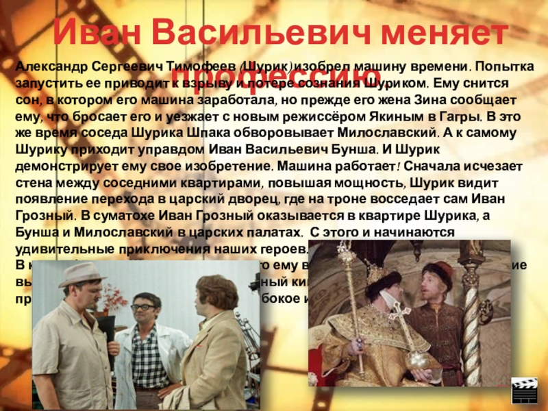 запустить ее приводит к взрыву и потере сознания Шуриком. Ему снится сон, в котором его машина заработала, но прежде его жена Зина сообщает ему, что бросает его и уезжает с новым режиссёром Якиным в Гагры. В это же время соседа Шурика Шпака обворовывает Милославский. А к самому Шурику приходит управдом Иван Васильевич Бунша. И Шурик демонстрирует ему свое изобретение. Машина работает! Сначала исчезает стена между соседними квартирами, повышая мощность, Шурик видит появление перехода в царский дворец, где на троне восседает сам Иван Грозный. В суматохе Иван Грозный оказывается в квартире Шурика, а Бунша и Милославский в царских палатах. С этого и начинаются удивительные приключения наших героев.