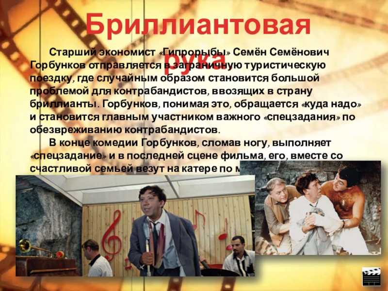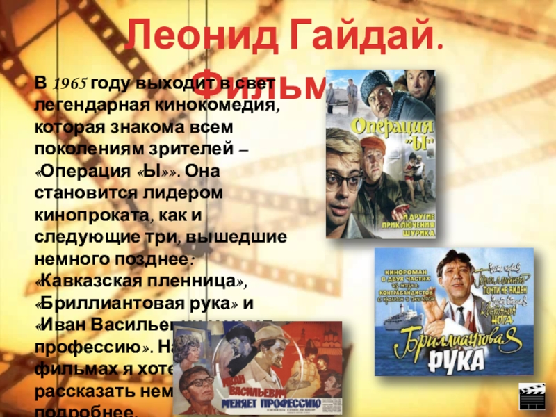 знакома всем поколениям зрителей – «Операция «Ы»». Она становится лидером кинопроката, как и следующие три, вышедшие немного позднее: «Кавказская пленница», «Бриллиантовая рука» и «Иван Васильевич меняет профессию». На этих фильмах я хотела бы рассказать немного подробнее.