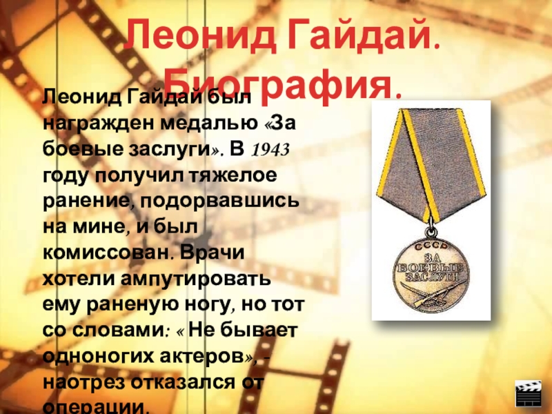 Леонид Гайдай был награжден медалью «За боевые заслуги». В