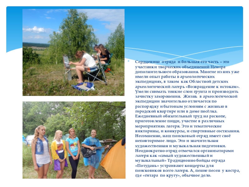 Центра дополнительного образования. Многие из них уже имели опыт работы в археологических экспедициях, в таком как Областной детских археологический лагерь «Возвращение к истокам». Умели снимать тонкие слои грунта и производить зачистку захоронения. Жизнь в археологической экспедиции значительно отличается по распорядку и бытовым условиям с жизнью в городской квартире или в доме посёлка. Ежедневный обязательный труд на раскопе, приготовление пищи, участие в различных мероприятиях лагеря. Это и тематические викторины, и конкурсы, и спортивные состязания. Несомненно, наш поисковый отряд имеет своё неповторимое лицо. Это и значительная художественная и музыкальная подготовки. Неоднократно отряд отмечался организаторами лагеря как «самый художественный и музыкальный» Традиционно бойцы отряда «Потудань» устраивают концерты для поисковиков всего лагеря. А, пение песен у костра, где «гитара по кругу», обычное дело.