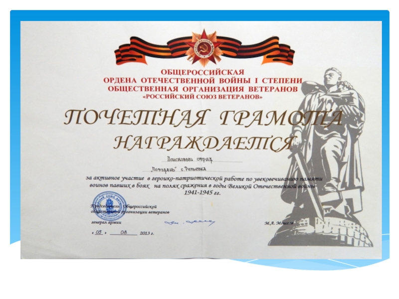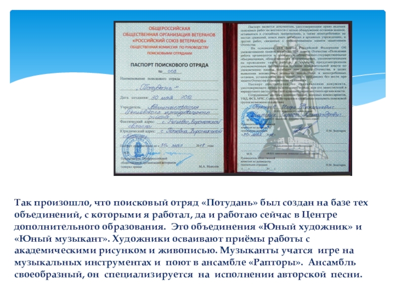 Слайд 1Современная роль и значение поискового отряда «Потудань» в нравственном и патриотическом