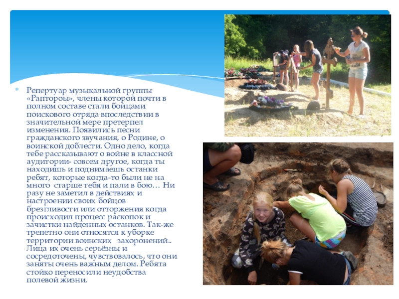 бойцами поискового отряда впоследствии в значительной мере претерпел изменения. Появились песни гражданского звучания, о Родине, о воинской доблести. Одно дело, когда тебе рассказывают о войне в классной аудитории- совсем другое, когда ты находишь и поднимаешь останки ребят, которые когда-то были не на много старше тебя и пали в бою… Ни разу не заметил в действиях и настроении своих бойцов брезгливости или отторжения когда происходил процесс раскопок и зачистки найденных останков. Так-же трепетно они относятся к уборке территории воинских захоронений.. Лица их очень серьёзны и сосредоточены, чувствовалось, что они заняты очень важным делом. Ребята стойко переносили неудобства полевой жизни.
