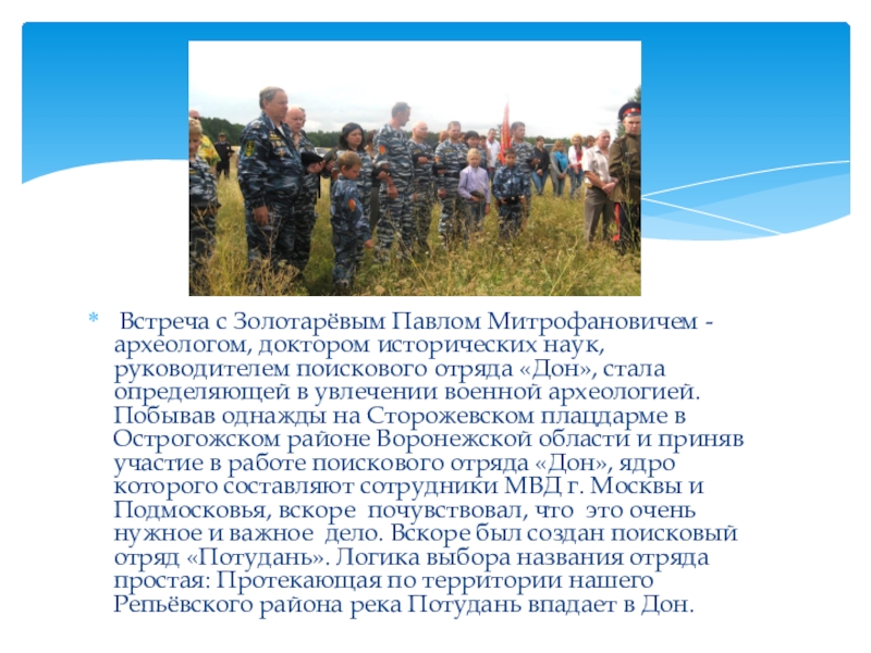 поискового отряда «Дон», стала определяющей в увлечении военной археологией. Побывав однажды на Сторожевском плацдарме в Острогожском районе Воронежской области и приняв участие в работе поискового отряда «Дон», ядро которого составляют сотрудники МВД г. Москвы и Подмосковья, вскоре почувствовал, что это очень нужное и важное дело. Вскоре был создан поисковый отряд «Потудань». Логика выбора названия отряда простая: Протекающая по территории нашего Репьёвского района река Потудань впадает в Дон.