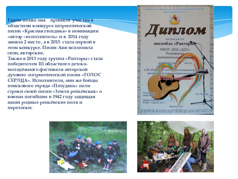 Слайд 7Годом позже она приняла участие в областном конкурсе патриотической песни