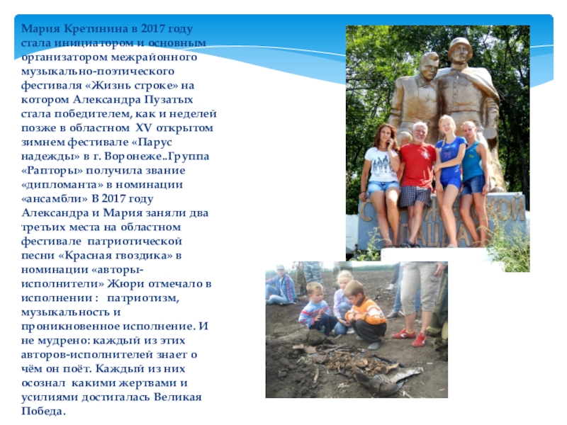 Слайд 12Мария Кретинина в 2017 году стала инициатором и основным организатором межрайонного
