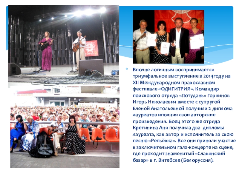 фестивале «ОДИГИТРИЯ». Командир поискового отряда «Потудань» Горяинов Игорь Николаевич вместе с супругой Еленой Анатольевной получили 2 диплома лауреатов иполняя свои авторские произведения. Боец этого же отряда Кретинина Аня получила два дипломы лауреата, как автор и исполнитель за свою песню «Репьёвка». Все они приняли участие в заключительном гала-концерте на сцене, где проходит знаменитый «Славянский базар» в г. Витебске (Белоруссия).