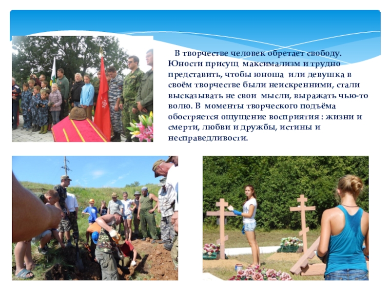 Слайд 9 В творчестве человек обретает свободу. Юности присущ максимализм и