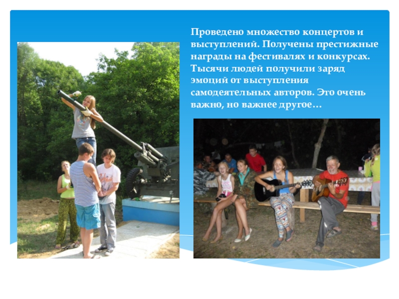 конкурсах. Тысячи людей получили заряд эмоций от выступления самодеятельных авторов. Это очень важно, но важнее другое…