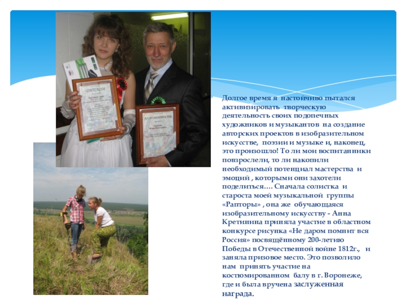и музыкантов на создание авторских проектов в изобразительном искусстве, поэзии и музыке и, наконец, это произошло! То ли мои воспитанники повзрослели, то ли накопили необходимый потенциал мастерства и эмоций , которыми они захотели поделиться…. Сначала солистка и староста моей музыкальной группы «Рапторы» , она же обучающаяся изобразительному искусству - Анна Кретинина приняла участие в областном конкурсе рисунка «Не даром помнит вся Россия» посвящённому 200-летию Победы в Отечественной войне 1812г., и заняла призовое место. Это позволило нам принять участие на костюмированном балу в г. Воронеже, где и была вручена заслуженная награда.