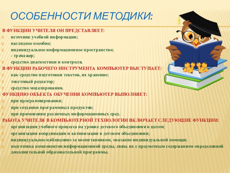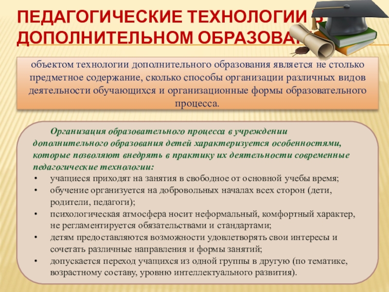 Организация образовательного процесса в учреждении дополнительного образования детей характеризуется особенностями, которые позволяют внедрять в практику их деятельности современные педагогические технологии: