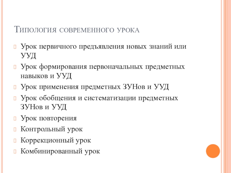 - использование различных типов уроков (урок усвоения новых знаний, формирование навыков и умений, применение знаний, навыков и умений, комбинированный урок и т.д.).