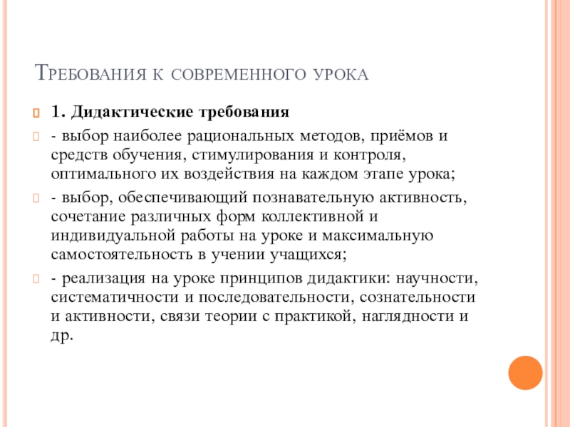 - реализация на уроке принципов дидактики: научности, систематичности и последовательности, сознательности и активности, связи теории с практикой, наглядности и др.